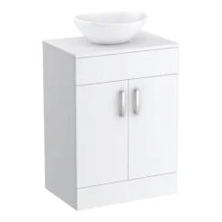 Toreno 605mm High Gloss Double Door Floor Standing Cabinet with White Worktop and Casca Oval Counter Top Basin