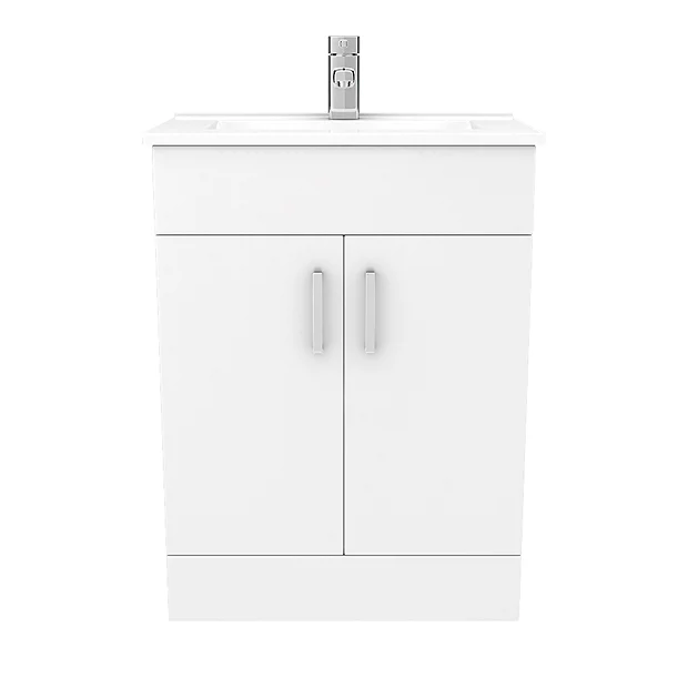 The Toreno Vanity Sink with Cabinet is part of a modern range of white bathroom furniture. The ceramic bathroom sink complements the bright gloss finish of the 600mm-wide unit underneath, with sleek chrome handles emphasising its contemporary look. Inside the soft close cupboard doors you’ll find two practical compartments that are ideal for storing your bathroom essentials.